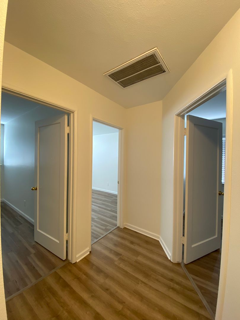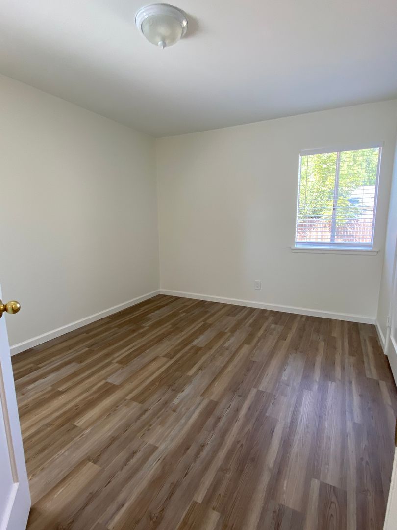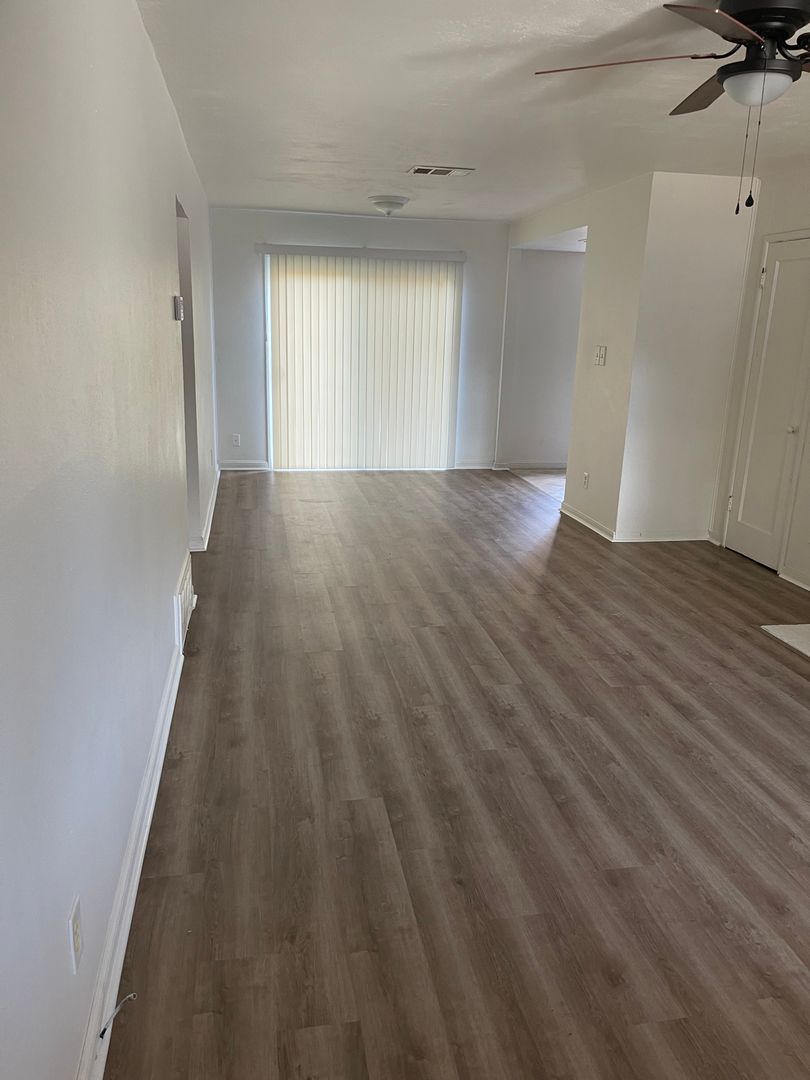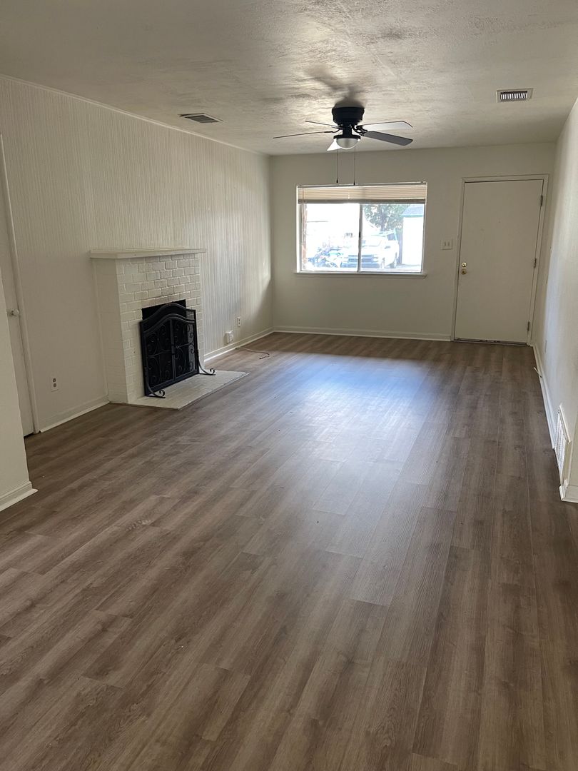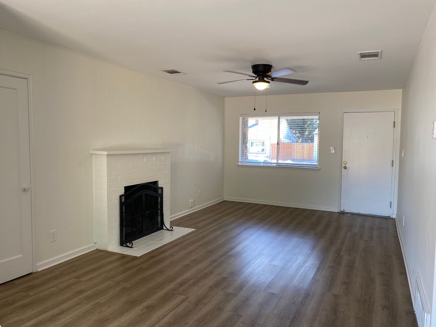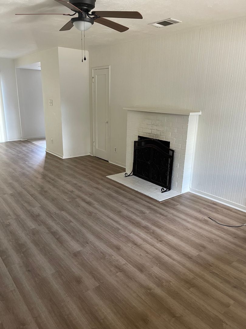 The front room centerpieces a beautiful brick fireplace. This home has been recently upgraded with new paint and laminate vinyl flooring.