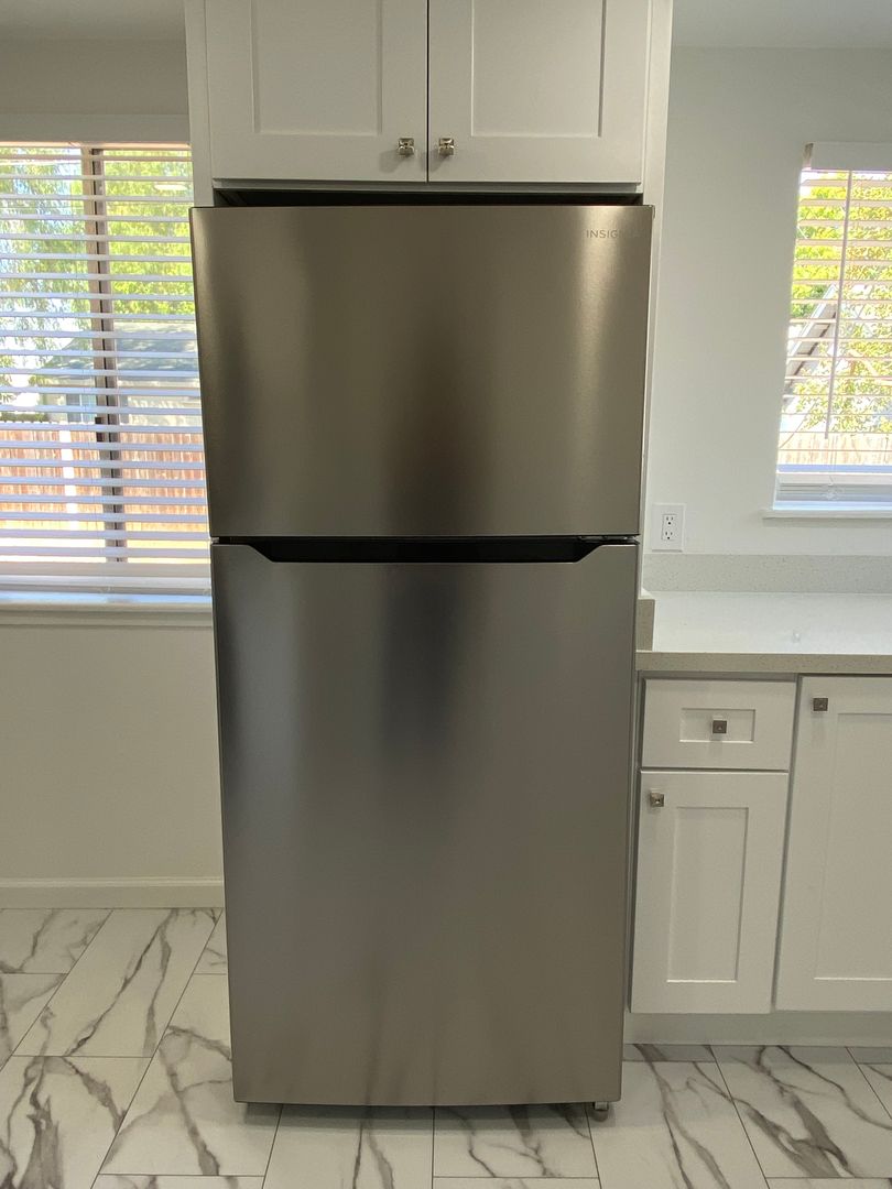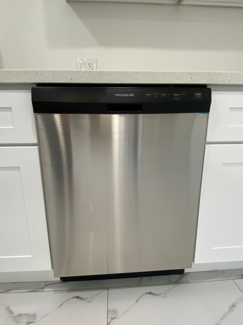 Brand new kitchen cabinets and appliances including microwave and refrigerator.