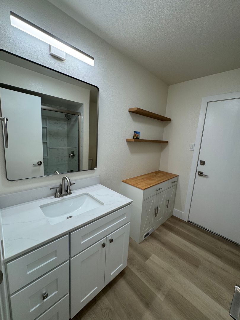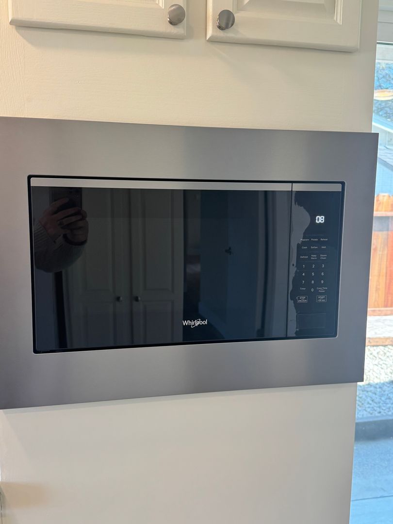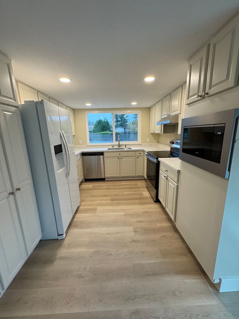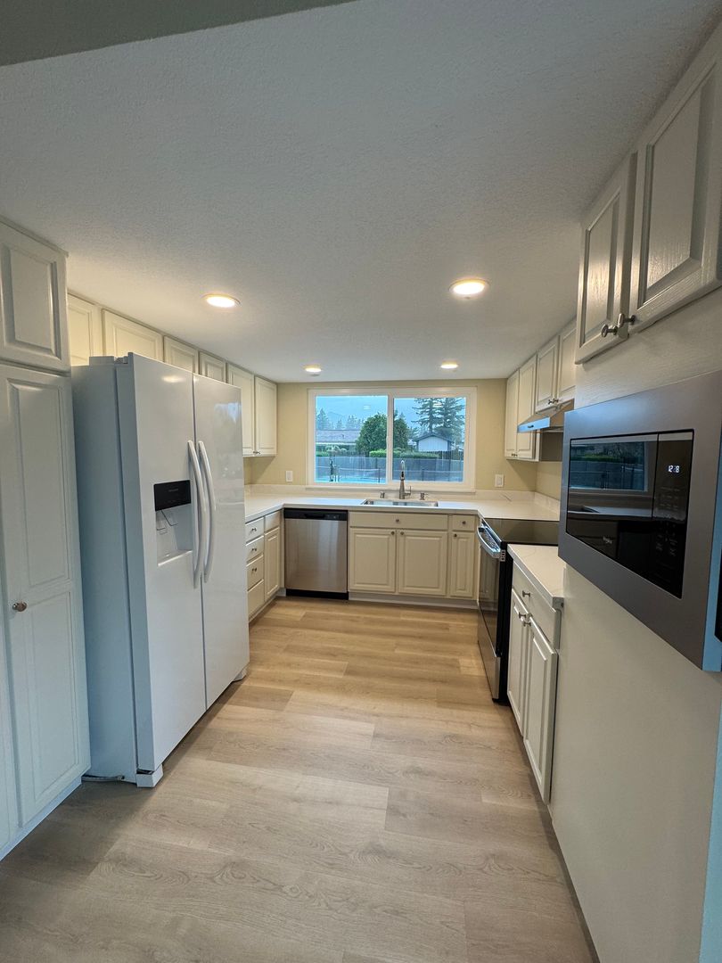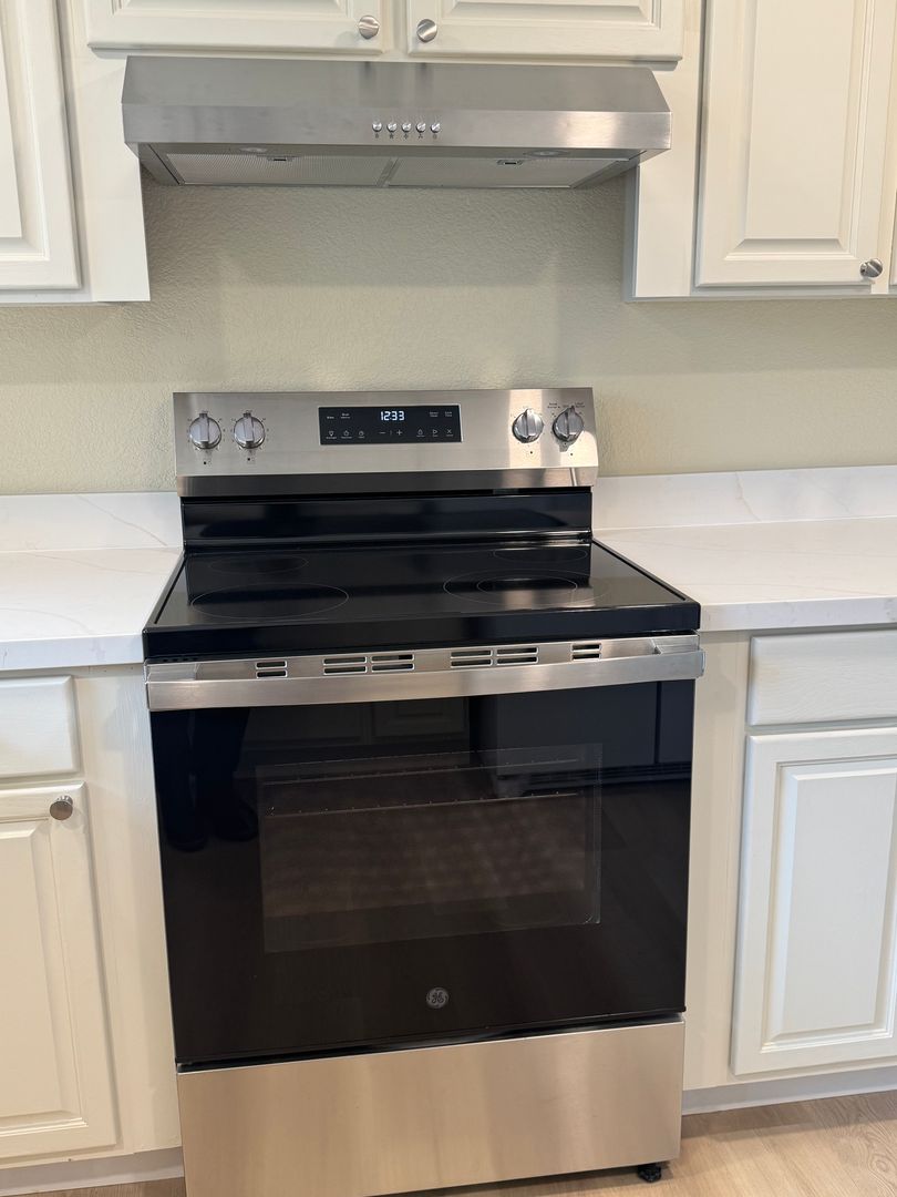 All new beautiful kitchen cabinets and counters, including new appliances, electric stove, microwave, refrigerator, and dishwasher.
