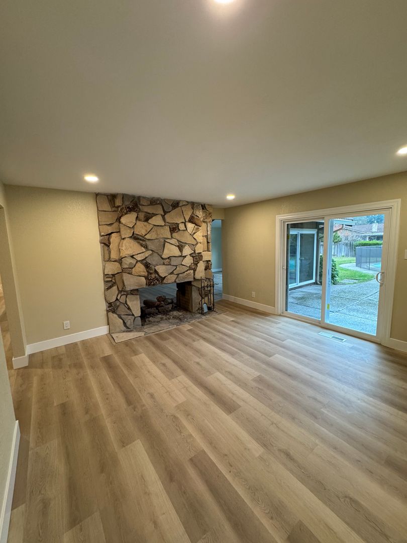 Features include a large open floor plan with lots of natural light, new LVP flooring throughout, and a beautiful double-sided fireplace.