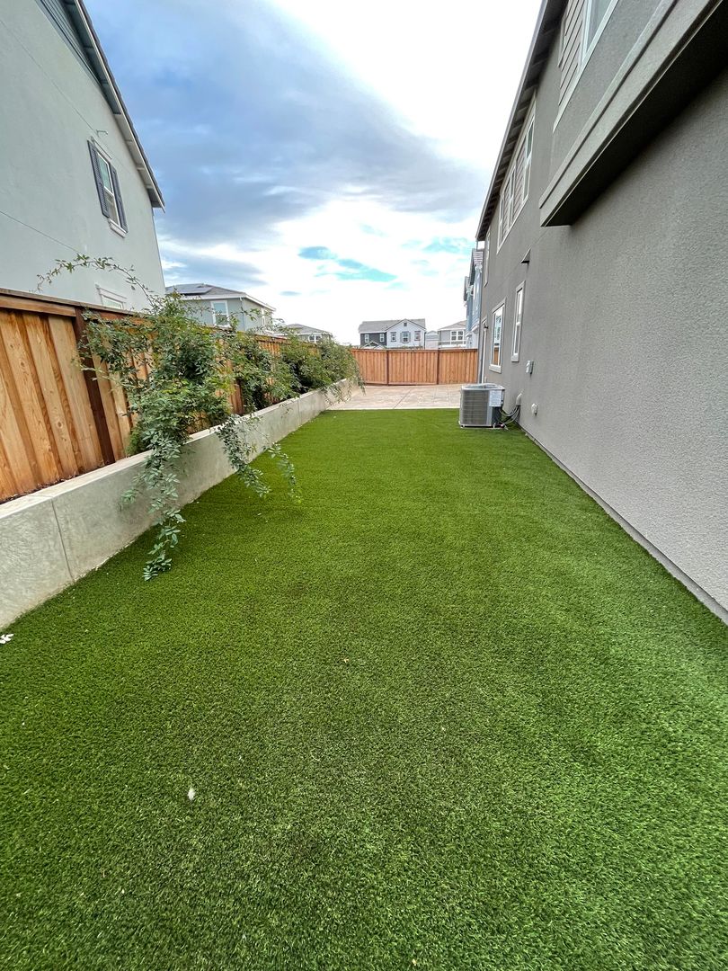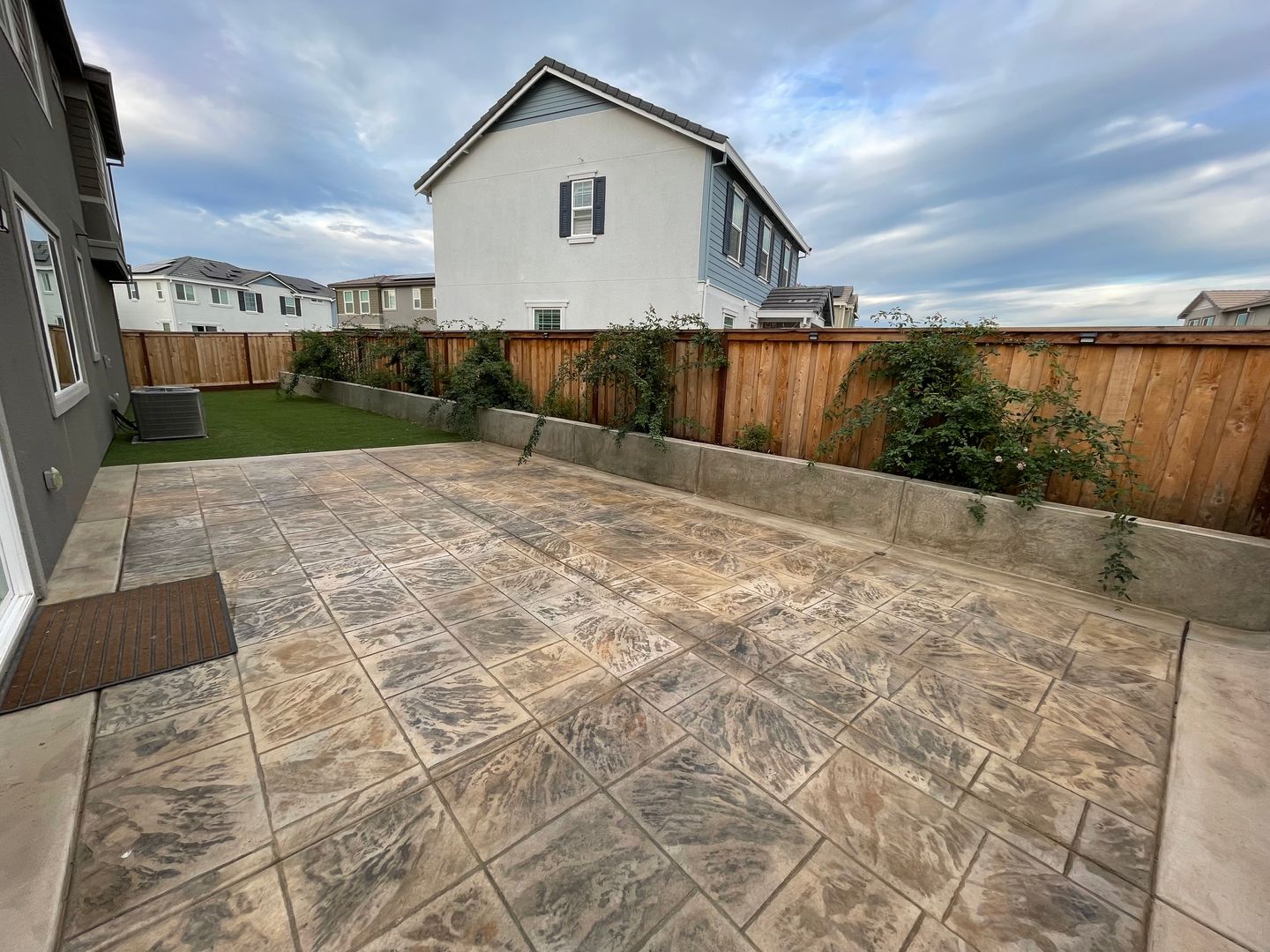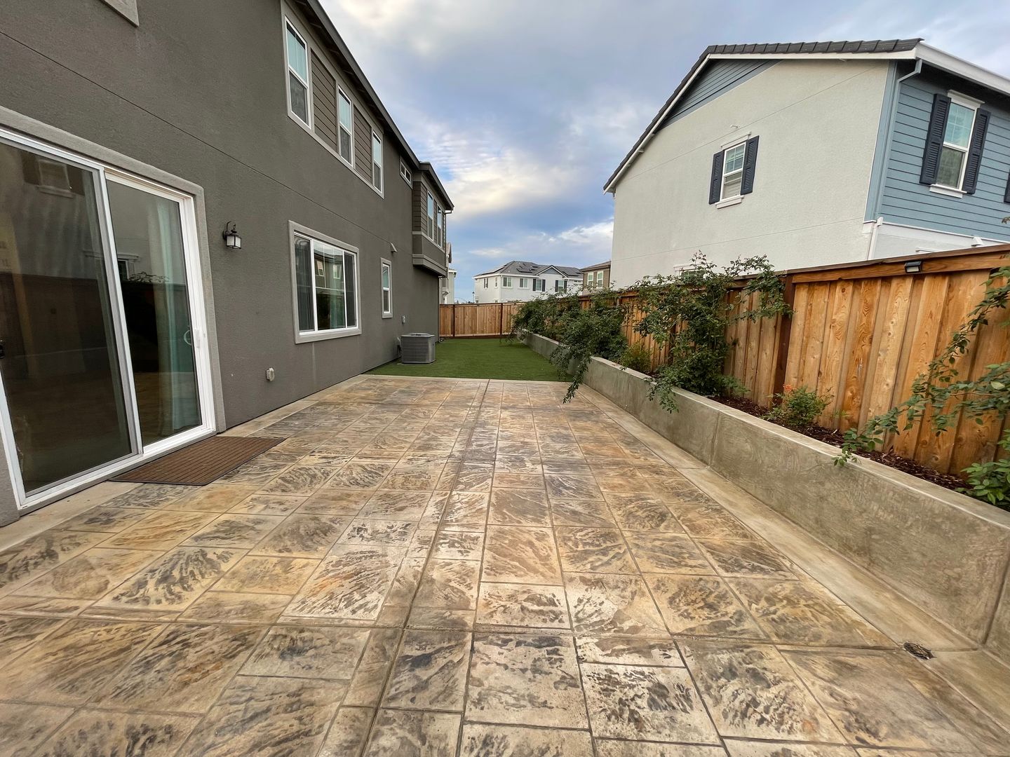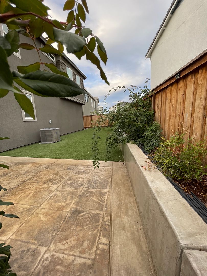 Low maintenance yard with turf and stamped concrete perfect for your fur friend